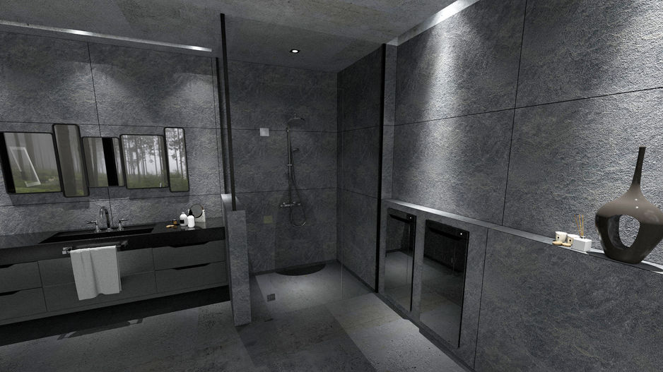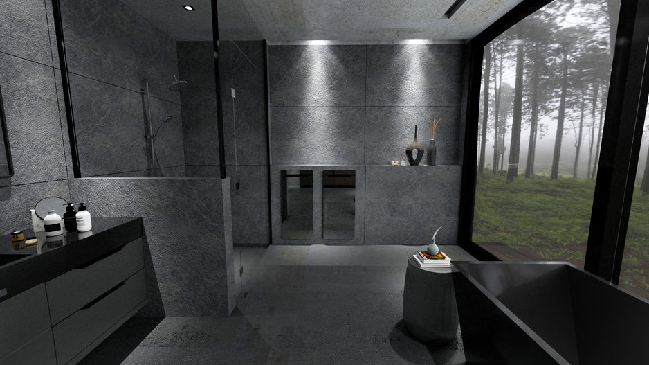 Ein Badezimmer in einem Haus inmitten einer nebligen Waldlandschaft. Bei der Auswahl der Materialien ist der Ausblick in die raue Natur die Inspiration für die Verwendung von Wandtafeln aus Schiefer und Boden- und Deckenfläche aus Sichtbeton. Schiefer und Beton spiegeln sich schemenhaft in der schwarzen Glasverkleidung von Zehnder Zenia, welche somit die gewünschte Ruhe und feine Eleganz des Raumes unterstreicht. Die Wahl von zwei Zehnder Zenia kommt den Nutzerwünschen nach Intimität entgegen.